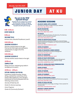 I've had the honor of leading the planning and execution of KU's eight Junior Day events each spring semester. Targeted at high school juniors, these events meet students where they are in the college search process and provide prospective Jayhawks with relevant resources. As an introduction to the college experience, guests are able to attend academic presentations from KU's professional schools, go on a campus tour, and experience on-campus housing and dining. KU Junior Days are presented as a day to "experience life on the Hill" and truly showcase the Jayhawk experience.